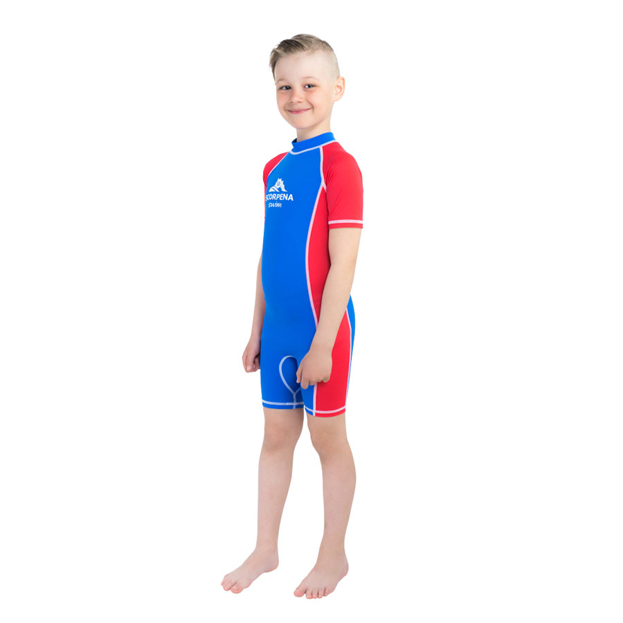 Детский укороченный комбинезон Scorpena Swim - удобный, лёгкий и красивый монокостюм с короткими рукавами. Изготовлен он из лайкры, которая обеспечивает защиту тела ребенка от пагубного воздействия UV-лучей. Застегивается сзади на молнию. Костюм представлен в двух вариантах сочетания ярко-красного и ярко-голубого цвета. Его дизайн очень привлекателен, а выразительность и интенсивность цветов делают детей заметными не только в воде, но и на берегу.