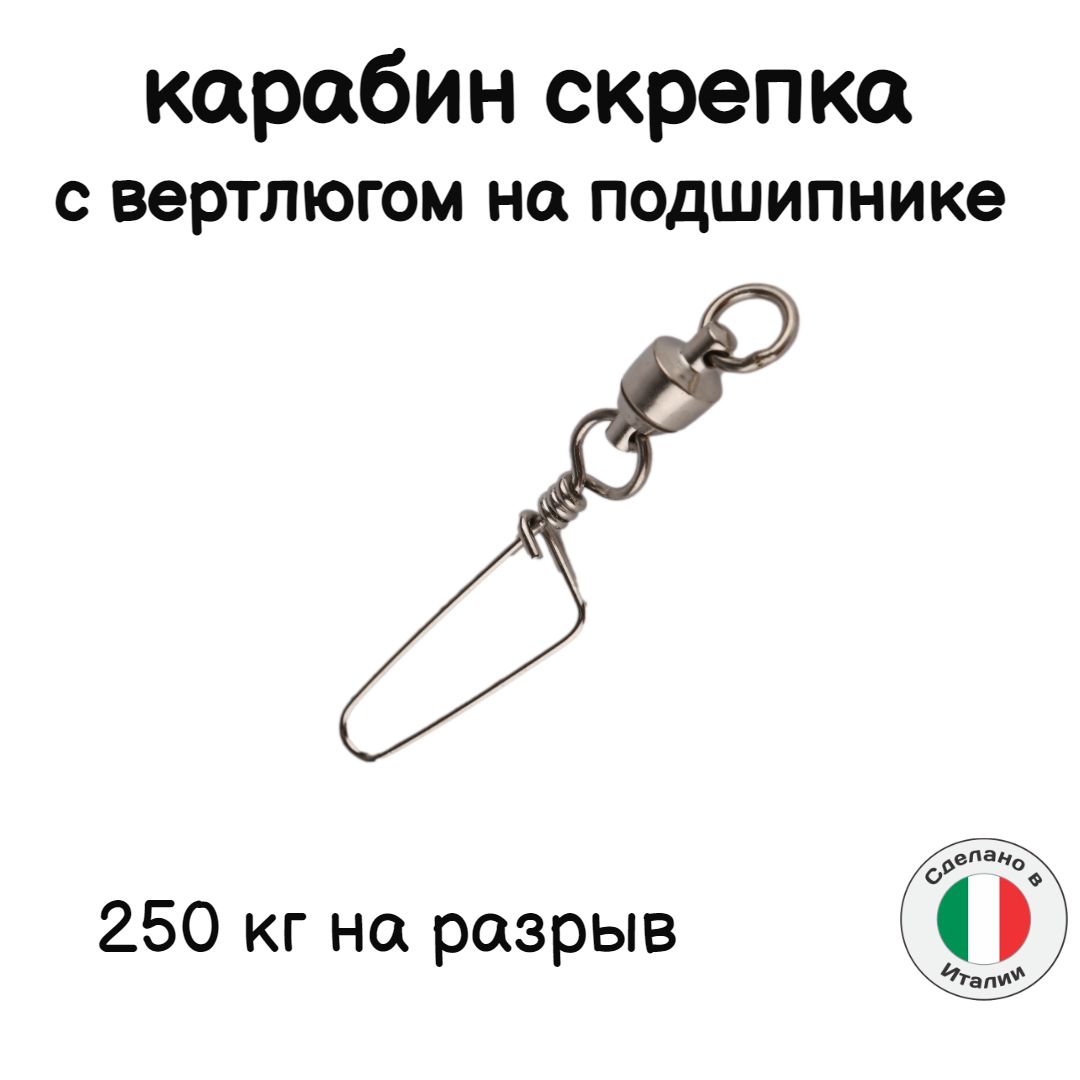 Карабин скрепка – удобный аксессуар в снаряжении подводного ружья. Соединяет рабочий линь гарпуна со вспомогательным линем (шнуром) катушки. Принцип работы карабина напоминает булавку: его можно открыть одной рукой, что даёт возможность оперативно отстегнуть линь гарпуна и снять добытую рыбу. Вертлюг исключает закручивание линя трофеем.- разрывная нагрузка 250 кгНезаменимая и удобная вещь для каждого подводного охотника. Позволяет закреплять на грузовом поясе кукан, герметичные боксы и прочее. Так же позволяет крепить запасные вещи и ружья к бую.