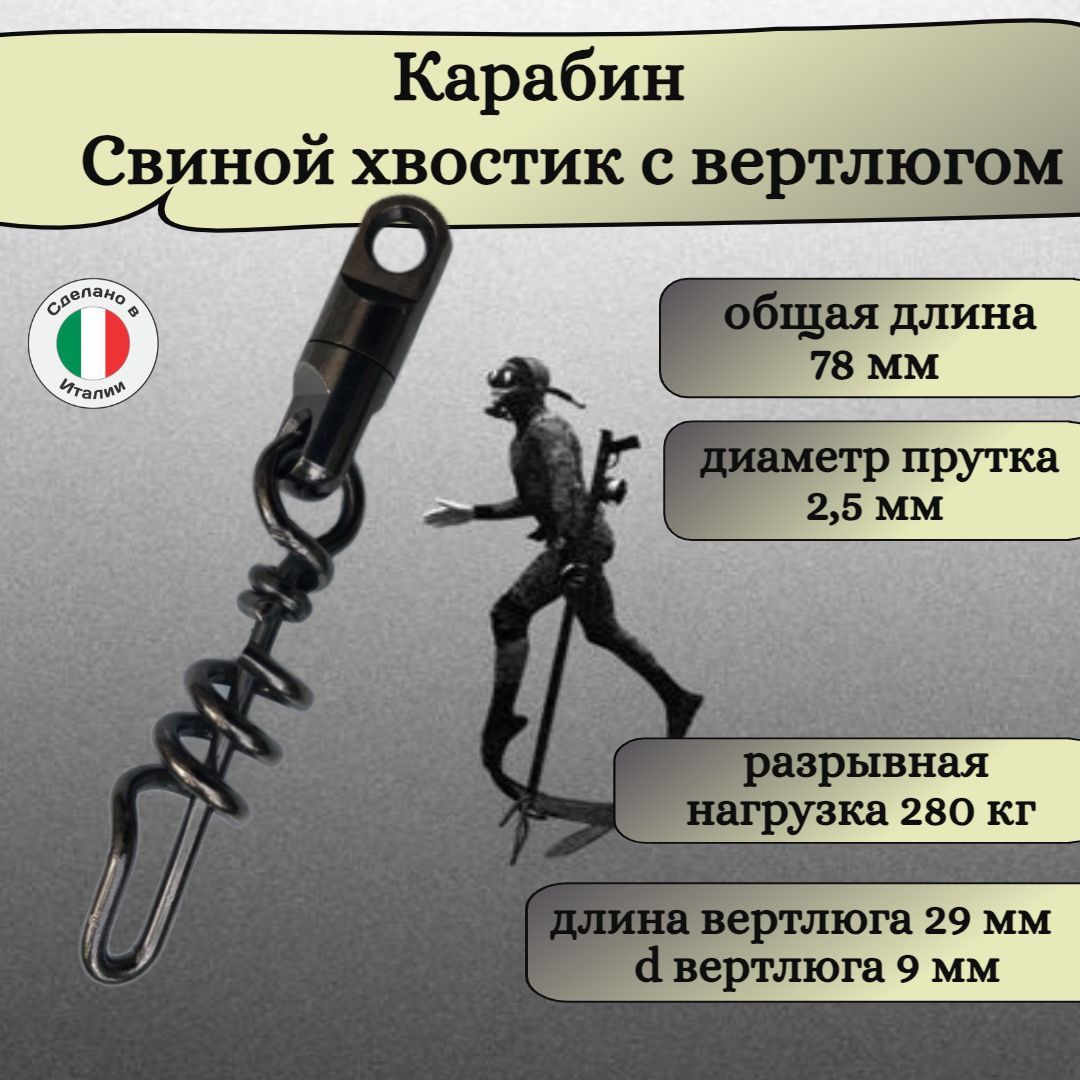 Витой карабин "свиной хвост с медным вертлюгом". Карабин, это одна из неотъемлемых деталей подводного ружья, как пневматического, так и арбалета. Замок необходим для быстрого отсоединения линя с гарпуном от ружья, для снятия простреленной насквозь рыбы или замены гарпуна с линём на запасной.