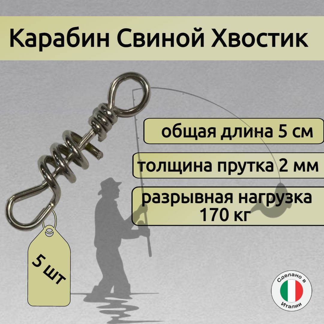 Карабин снабжен витым замком "свиной хвост". Карабин, это одна из неотъемлемых деталей для летней и зимней рыбалки.