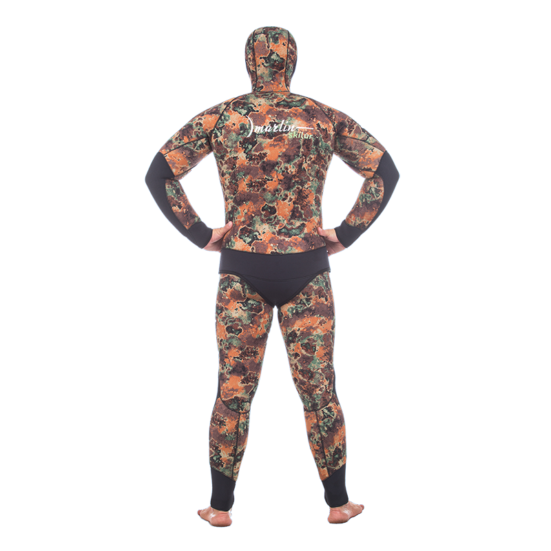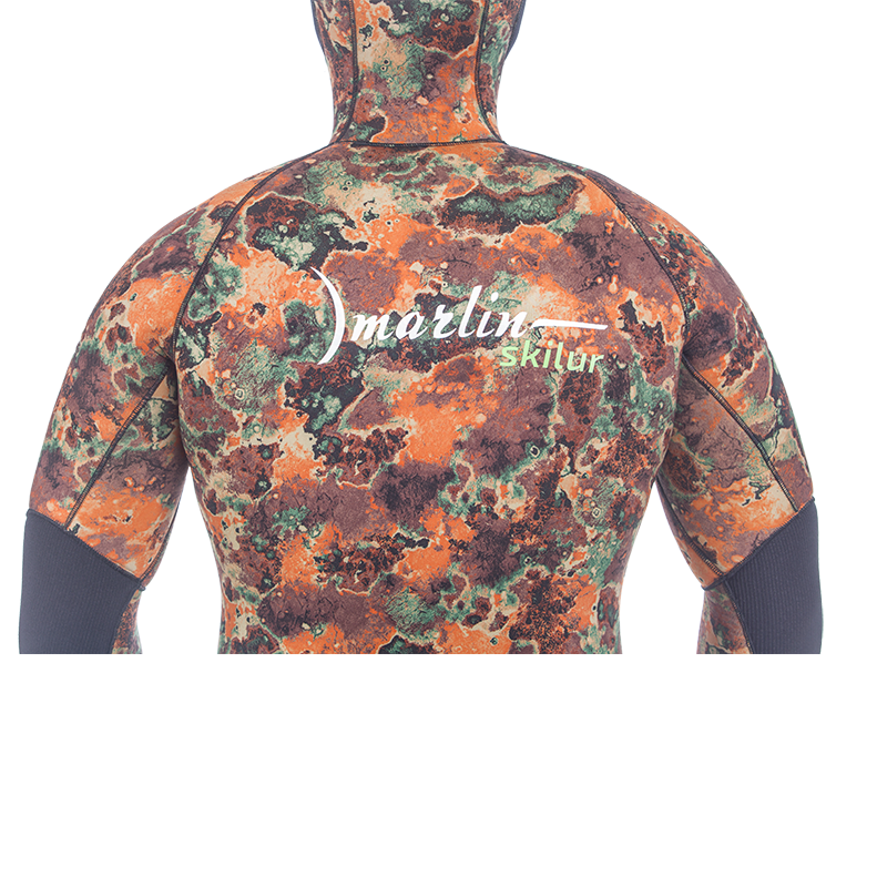 Гидрокостюм Marlin Skilur Brown (Марлин Скилур браун) – новая модель гидрокостюма из коричневого камуфляжа.В изготовлении этого гидрокостюма применяется эластичный, мягкий, неопрен премиум класса фирмы Шейко. Снаружи неопрен покрыт сверхрастяжимой камуфлированной лайкрой, внутри – открытая пора.Анатомический крой гидрокостюма идеально садится по фигуре. В брюках-комбинезоне типа Long John в области майки применяется меньшая толщина неопрена (в моделях толщиной 7 и 9 мм), для облегчения дыхания охотника. Куртка имеет крой типа реглан, который дополнительно увеличивает комфорт и создает максимальное прилегание гидрокостюма при эксплуатации. Обтюраторы из материала smooth skin (смус скин) на ногах, руках и шлеме, дополнительно предотвращают попадание воды вовнутрь гидрокостюма.Гидрокостюм проклеен неопреновым клеем, рекомендованным специалистами корпорации Шейко. Швы костюма, выполненные на специализированном немецком оборудовании имеют двухниточное плетение – что существенно увеличивает их долговечность и прочность.Вшитый в гидрокостюм упор для зарядки ружей, в отличии от приклееных аналогов, исключает отрывание его в процессе эксплуатации. Материал duratex (дюратекс) защищает колени и локти костюма от преждевременного истирания. Для исключения возможности повреждения гидрокостюма в процессе одевания и снятия, нижняя часть куртки изготавливается из двудублированого неопрена (нейлон\нейлон), тем самым увеличивая срок эксплуатации гидрокостюма.