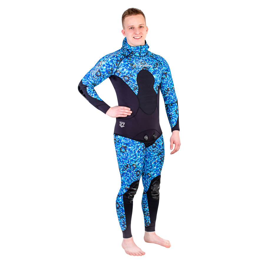 Костюм изготовлен из мягкого и эластичного неопрена Sheico. Внутренняя сторона костюма – открытая пора. С наружной стороны покрыт лайкрой, самым эластичным на рынке тканей материалом. Нить лайкры содержит резиновую составляющую, поэтому очень хорошо тянется. Такое покрытие не ограничивает свойства неопрена к растяжимости, костюм легко садится по фигуре и не ограничивает движения в суставах. Куртка не мешает глубоко дышать, мышцы грудной клетки не утомляются, и охотник способен нырять дольше и глубже.