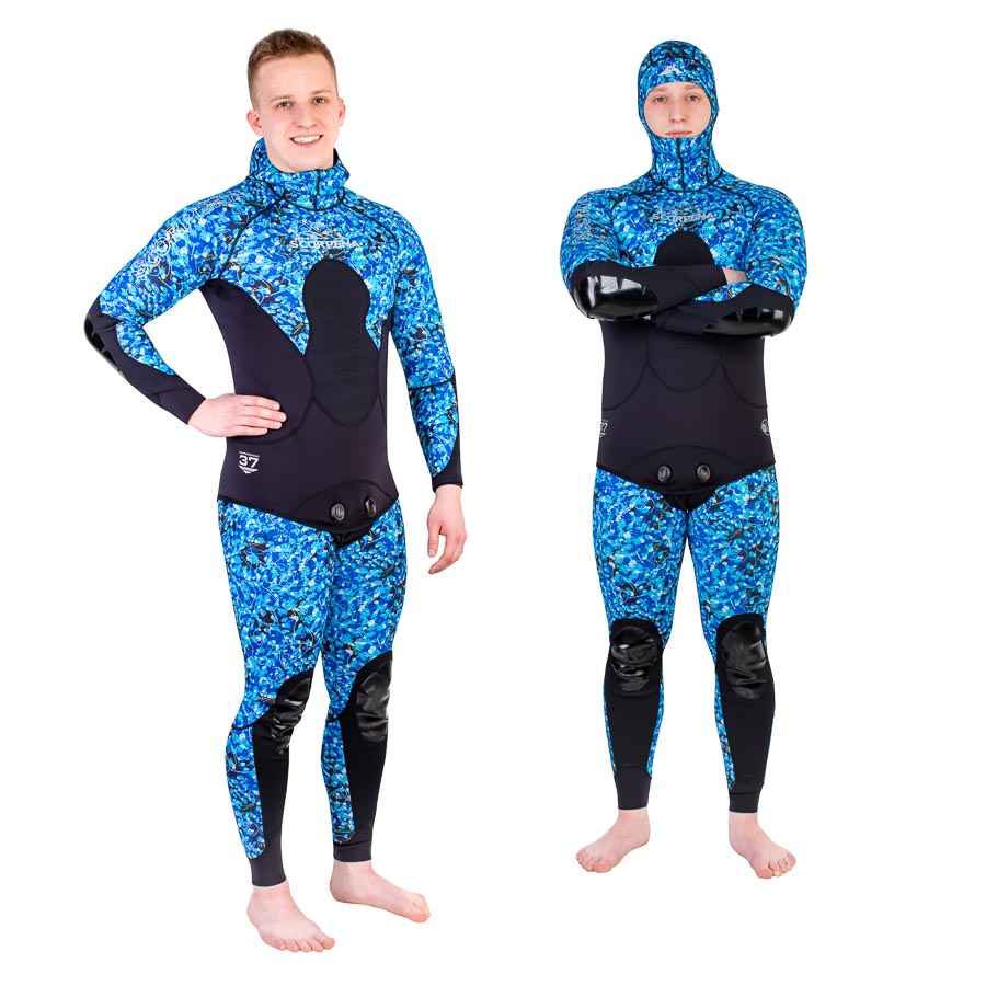 Манжеты рукавов и штанин и лицевые обтюраторы сделаны из более тонкого неопрена (2,5 мм – на 3 мм костюме) для большей эластичности. Верхняя часть штанов и шейные детали также тоньше, чтобы облегчать движения охотника и не мешать глубокому дыханию и движениям. Удобство и комфорт при нырянии в этом костюме гарантированы.