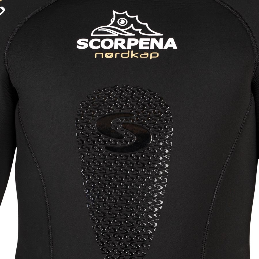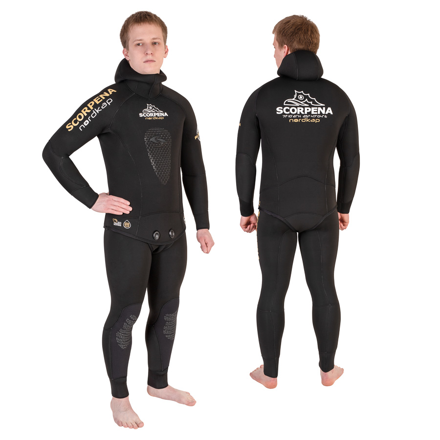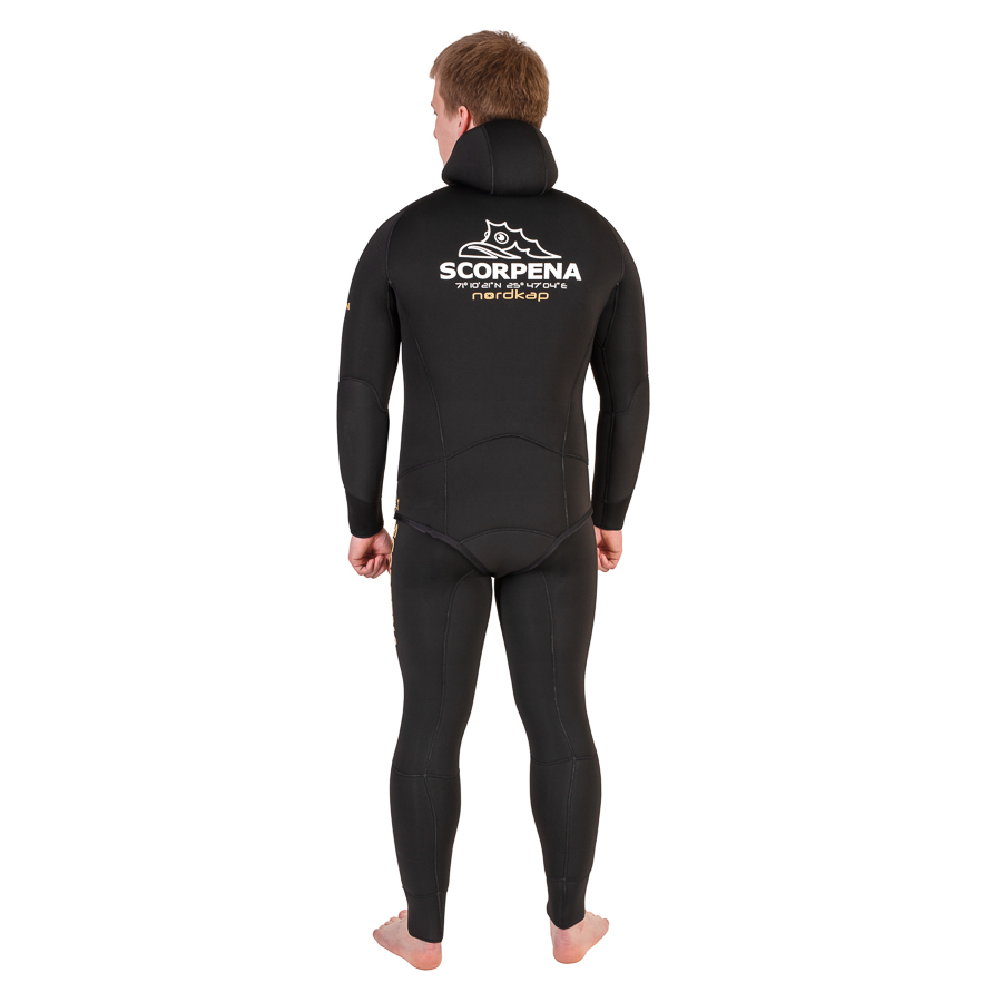 Гидрокостюм Scorpena NordKap имеет сложный крой из большого количества деталей, что делает его очень анатомичным и обеспечивает максимальную теплоизоляцию. Манжеты и обтюрация шлема выполнена из 7 мм неопрена, что способствует более комфортному использованию гидрокостюма. Костюм состоит из куртки с капюшоном и комбинезона с лямками.