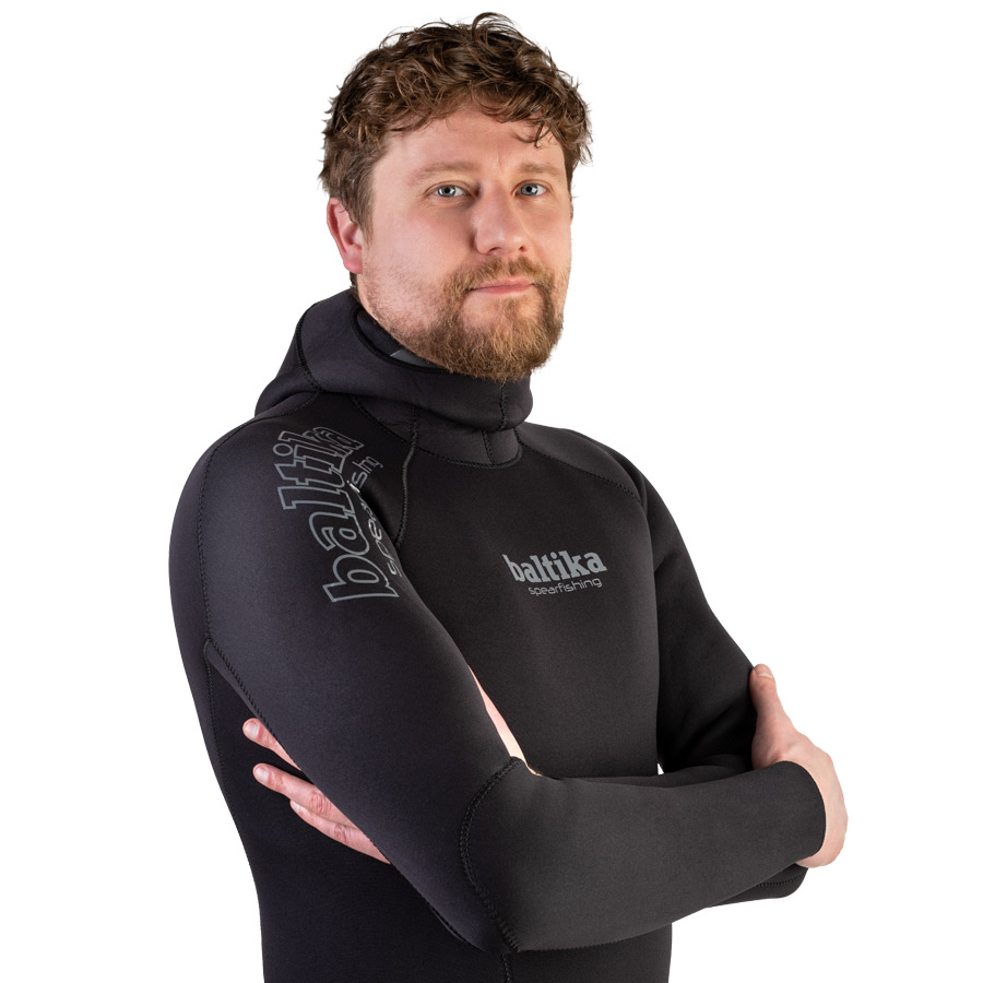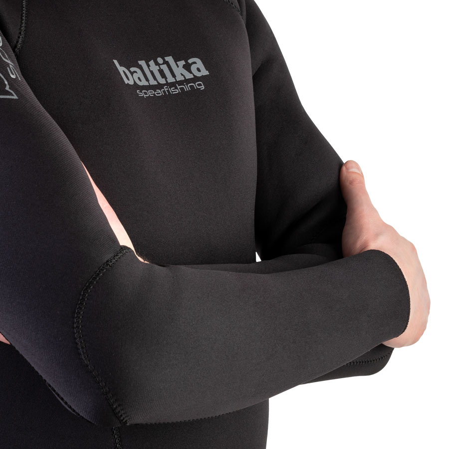 Особенность гидрокостюма Baltika - отсутствие жёсткой накладки на груди для упора арбалета. Большинство начинающих , а так же тех подводных охотников, кто использует гидрокостюмы 5 или 7 мм толщиной - пользуются пневматическим ружьём, которое не нужно упирать в грудь при зарядке. Потому накладка им и не нужна. Отсутствие жёсткой вставки в грудной области делает эту часть гидрокостюма мягче и эластичнее, поэтому глубокое дыхание в Baltika практически ничем не затрудняется. Это делает гидрокостюмы Baltika так же интересными и для фридайверов.