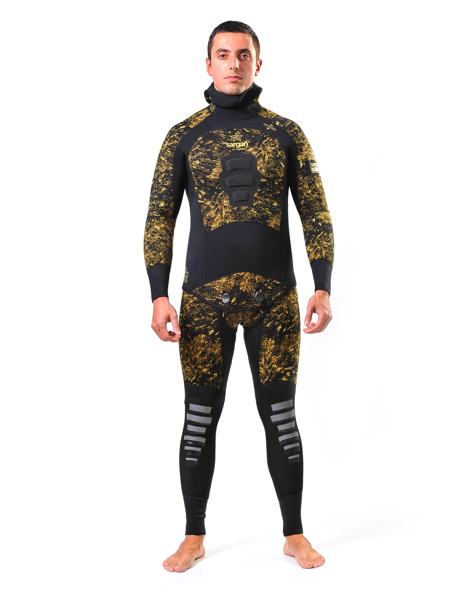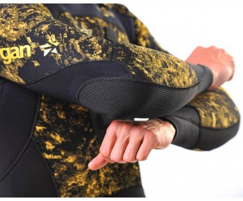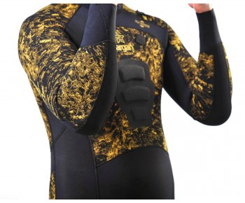 Оригинальный «фридайверский клин», в виде широкой подмышечной полосы (5), идущей от локтя до середины куртки, соединяется с грудной и боковой вставками, а через боковую с брюшной вставкой и спинным амортизатором. Эта деталь обеспечивает упругое растяжение неопрена (до 300 %) на локтевом сгибе (6) и комфортное растяжение при вытягивании рук вперед-вверх.