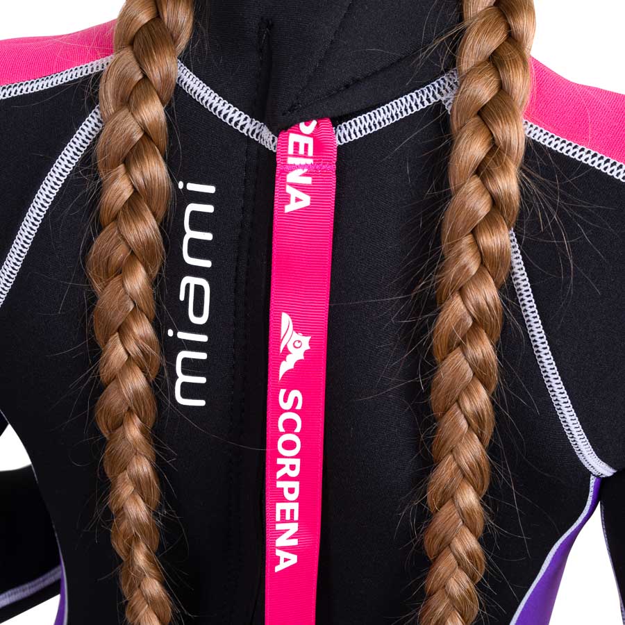 Гидрокостюм Scorpena Miami-2 изготовлен из 3 мм неопрена с двухсторонним покрытием тканью. Чтобы ничего не натирало тела пловцов во время активных движений в воде, все швы на костюме выполнены плоскими. А для надёжности эти швы выполнены многониточными. Для удобства надевания гидрокостюм Scorpena Miami оснащён застёжкой-молнией проходящей вертикально по спине. Эта прочная молния с крупными зубчиками снабжена планкой изнутри - для уменьшения проникновения воды под костюм, а бегунок замка оснащён длинной фирменной петлёй Scorpena для облегчения застёгивания. Верхний мягкий клапан на липучке Velcro обеспечивает плотное прилегание воротничка к шее, а также фиксацию бегунка в застегнутом положении. По верхнему краю воротничка проходит так называемый Аквастоп - мягкая манжета из неопрена со специальным покрытием - для предотвращения затекания воды по шее внутрь костюма.
