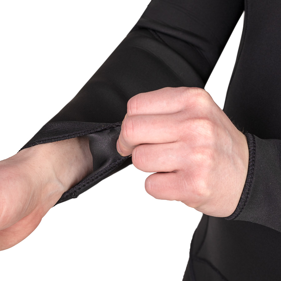 Широкая лицевая манжета и манжеты на лодыжках изготовлены из более тонкого неопрена и имеют покрытие glideskin, облегчающее надевание. Широкий пояс на штанах также выполнен из более тонкого эластичного неопрена и сужается кверху, что улучшает посадку и гарантированно предотвращает проникновение воды внутрь. Сзади пояс существенно выше, что обеспечивает дополнительную теплозащиту. Для удобства просушки штаны оснащены петличками по бокам. Нижний брасовый ремень куртки усилен с обеих сторон тканью .<br>