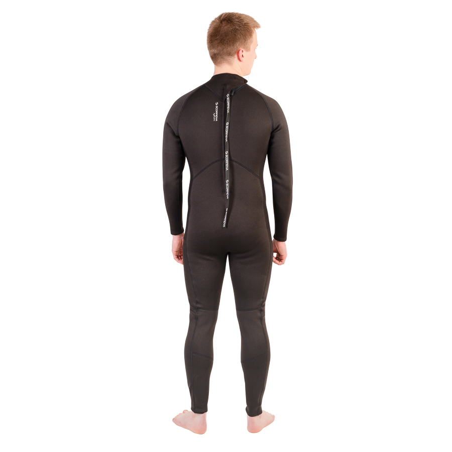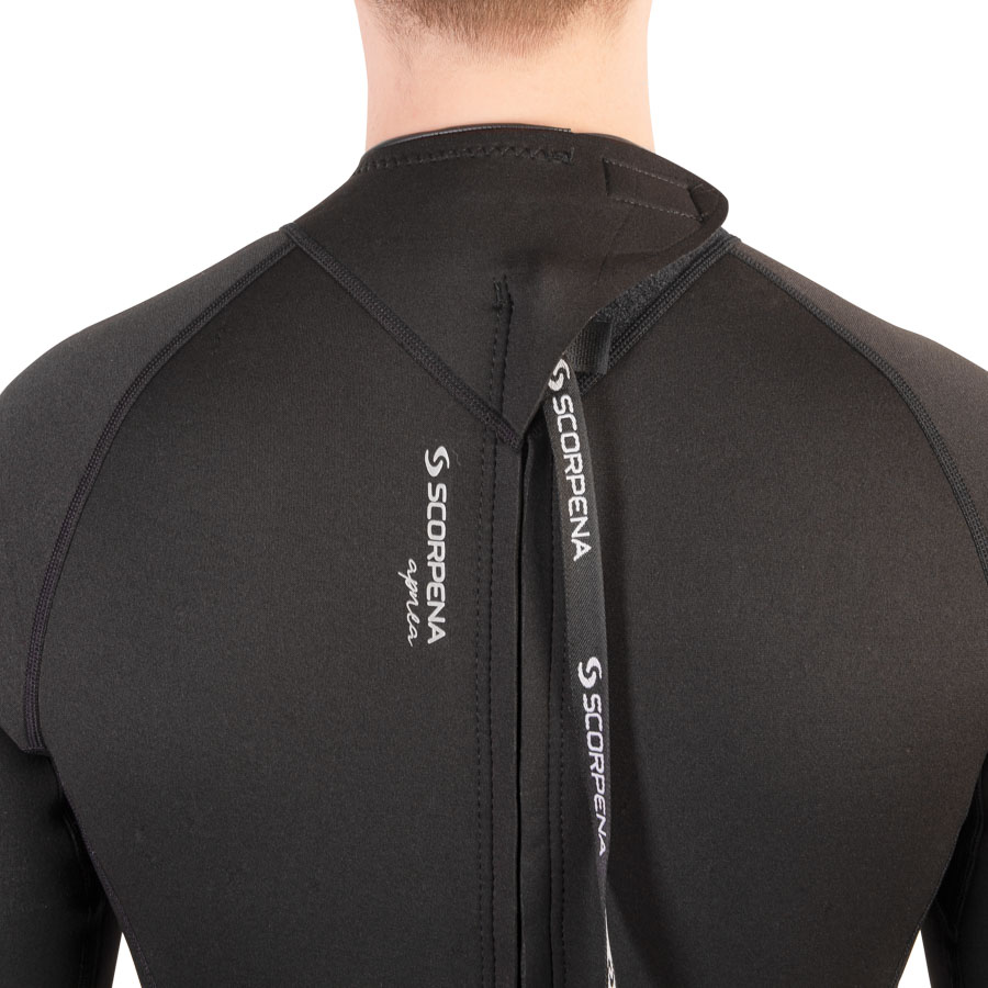 Этот монокостюм имеет на спине длинную вертикальную молнию. Прочная молния с крупными зубчиками снабжена планкой изнутри - для уменьшения проникновения воды под костюм, а бегунок замка оснащён длинной фирменной петлёй Scorpena для облегчения застёгивания. Бегунок застёжки-молнии смещён для предотвращения давления на самый выступающий шейный позвонок, что особенно важно при использовании фридайверами популярных шейных грузов. Чтобы затёжка-молния не могла самопроизвольно постепенно расстёгиваться при высоких скоростях плавания, мы добавили фиксатор бегунка в застёгнутом положении. Лента для застёгивания/расстёгивании молнии сделана с фактурной поверхностью для лучшего удержания её мокрыми руками.