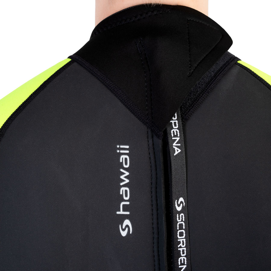 Удобный крой и плоские многониточные швы обеспечивают высокий комфорт при использовании Scorpena Hawaii. На воротничке гидрокостюмов применён особый неопрен Glideskin, который не натирает кожу и обеспечивает наиболее плотное и комфортное прилегание к телу препятствуя, тем самым, проникновению воды под костюм.  А регулируемая в широком диапазоне застёжка-липучка позволяет учесть индивидуальные предпочтения по плотности обхвата шеи.