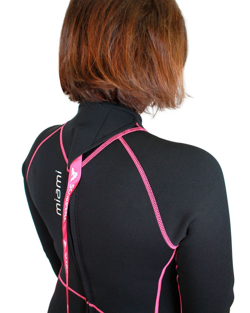 Гидрокостюм Scorpena Miami-2 изготовлен из 3 мм неопрена с двухсторонним покрытием тканью. Чтобы ничего не натирало тела пловцов во время активных движений в воде, все швы на костюме выполнены плоскими. А для надёжности эти швы выполнены многониточными. Для удобства надевания гидрокостюм Scorpena Miami оснащён застёжкой-молнией проходящей вертикально по спине. Эта прочная молния с крупными зубчиками снабжена планкой изнутри - для уменьшения проникновения воды под костюм, а бегунок замка оснащён длинной фирменной петлёй Scorpena для облегчения застёгивания. Верхний мягкий клапан на липучке Velcro обеспечивает плотное прилегание воротничка к шее, а также фиксацию бегунка в застегнутом положении. По верхнему краю воротничка проходит так называемый Аквастоп - мягкая манжета из неопрена со специальным покрытием - для предотвращения затекания воды по шее внутрь костюма.