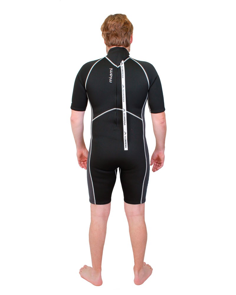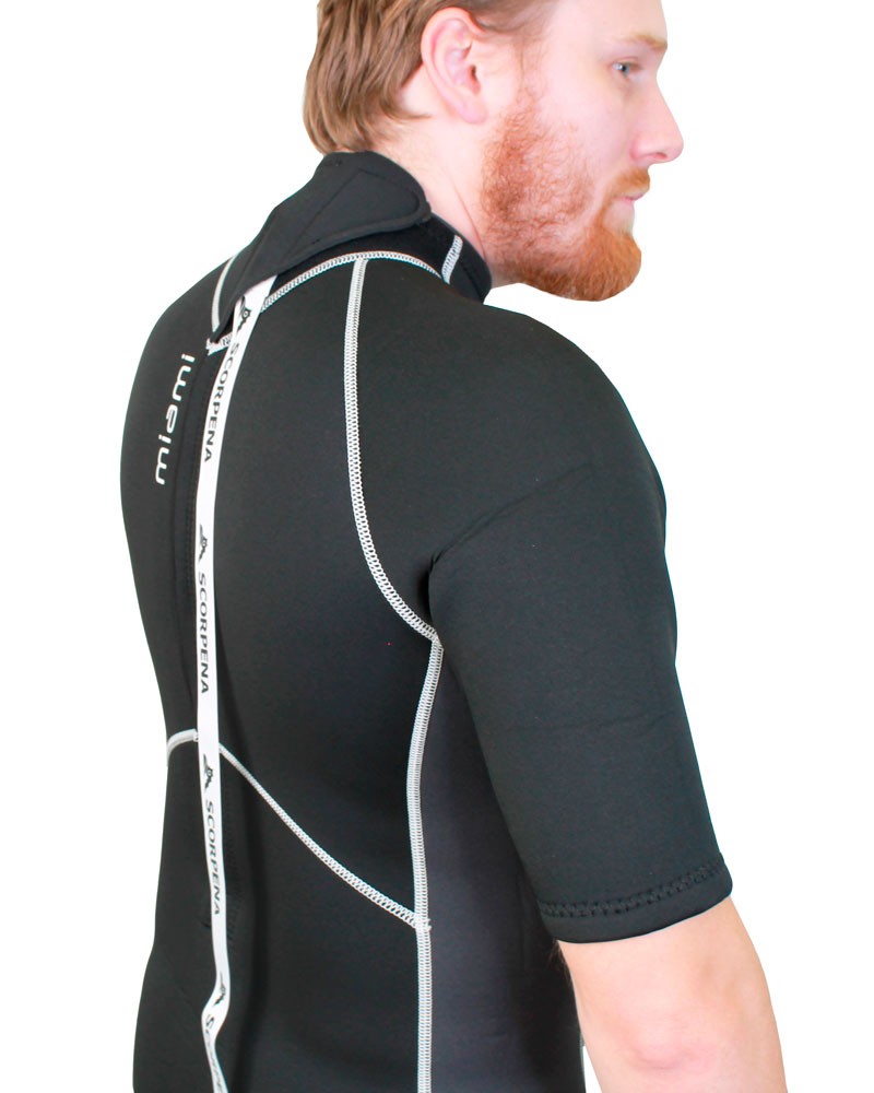 Гидрокостюм Scorpena Miami-2 изготовлен из 3 мм неопрена с двухсторонним покрытием тканью. Чтобы ничего не натирало тела пловцов во время активных движений в воде, все швы на костюме выполнены плоскими. А для надёжности эти швы выполнены многониточными. Для удобства надевания гидрокостюм Scorpena Miami оснащён застёжкой-молнией проходящей вертикально по спине. Эта прочная молния с крупными зубчиками снабжена планкой изнутри - для уменьшения проникновения воды под костюм, а бегунок замка оснащён длинной фирменной петлёй Scorpena для облегчения застёгивания. Верхний мягкий клапан на липучке Velcro обеспечивает плотное прилегание воротничка к шее, а также фиксацию бегунка в застегнутом положении. По верхнему краю воротничка проходит так называемый Аквастоп - мягкая манжета из неопрена со специальным покрытием - для предотвращения затекания воды по шее внутрь костюма.