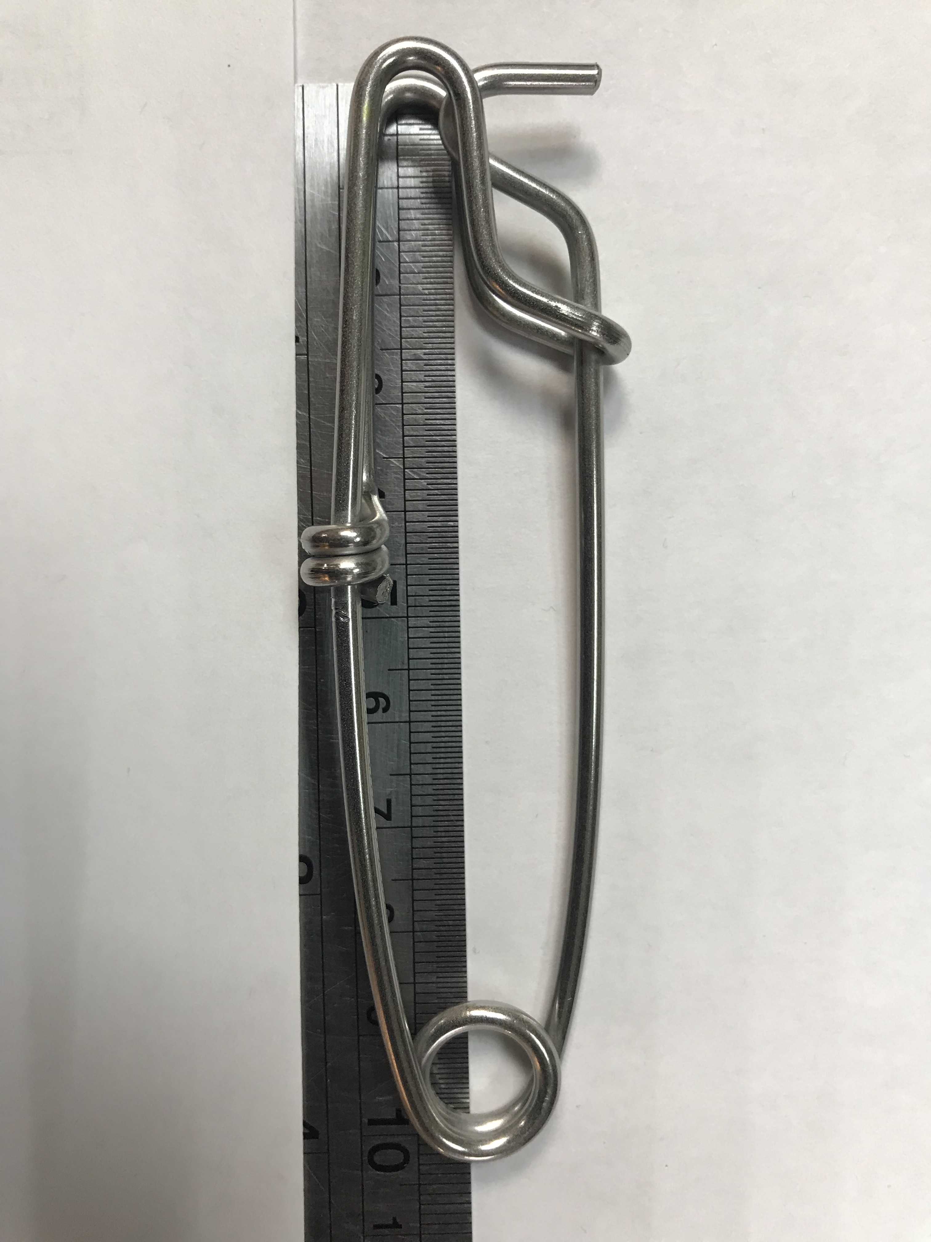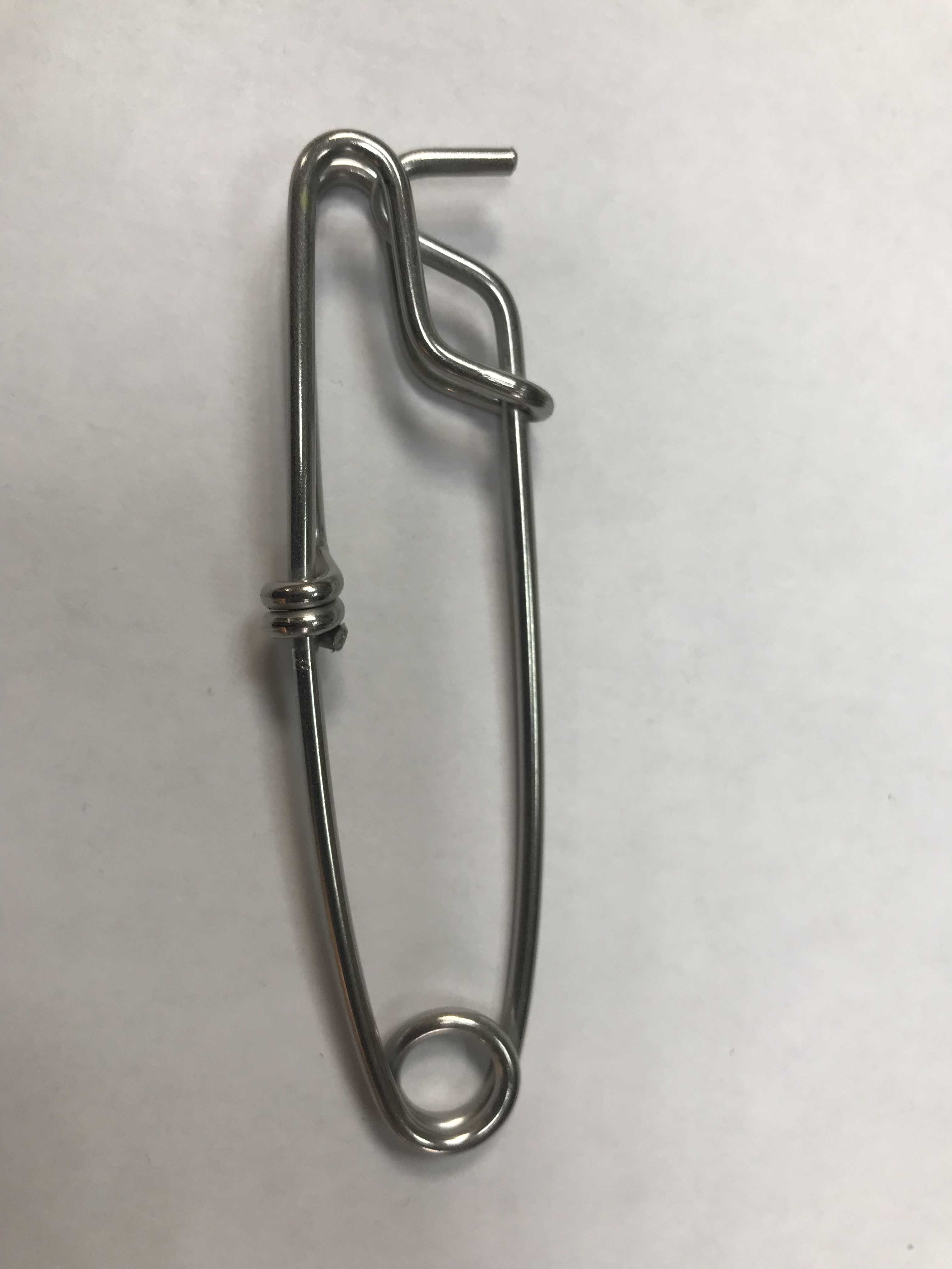 Изготовлен из нержавеющей пружинной стали. Длина 100 мм. Диаметр проволоки 2,5 мм. Ориентировочное усилие на разрыв – 150-200 кг. Предназначен для крепления гарпун-линя к катушечному шнуру, для удобного и быстрого извлечения гарпуна из тела рыбы. Также применяется как быстросъемный крепеж различного оборудования к поясу, маркер-бую. Конструкция данного карабина прошла испытание временем. В течение десятилетий его используют подводные охотники всего мира в соленых и пресных водах.