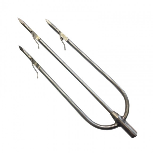 Трезубец плоский 3 грани. Длина зубьев 20 см. Резьба М7х1. Длина 25 см, диаметр зубьев 6 мм. Термообработка придает режущей грани свойства держать заточку, а телу наконечника выдерживать значительные нагрузки на изгиб и излом. Последующий отпуск снимает напряжение с металла избавляя его от излишней хрупкости. Посадка на тело гарпуна почти полностью снимает нагрузку с резьбового соединения. Максимальная проникающая способность наконечников достигнута оптимальным углом атаки жала. Лепестки имеют оригинальную форму и не залипают даже при попадании. Плотное, симметричное оси наконечника, прилегание лепестков позволяет стрелять на ещё большие расстояния, не боясь увода гарпуна в сторону.