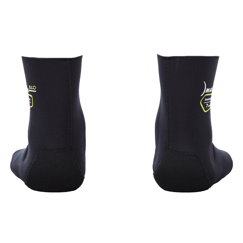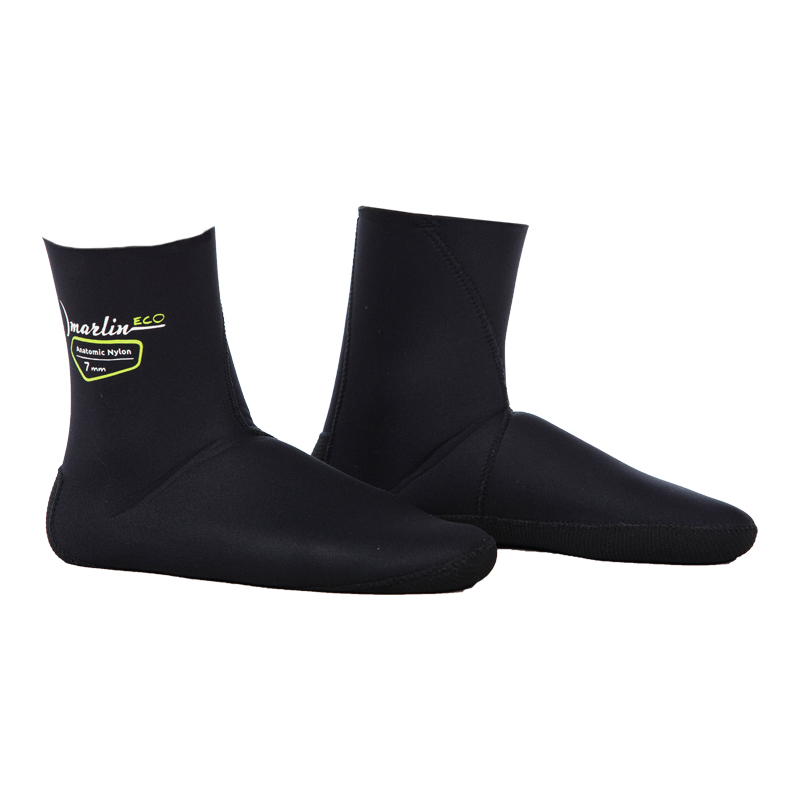 Носки Marlin Anatomic Nylon Eco (Марлин Анатомик Нейлон Эко) выполнены из эластичного неопрена фирмы Sheico L, имеют анатомический крой (правый, левый). Внутри - нейлон, наружное покрытие – нейлон. Подошва для лучшей износостойкости выполнена из более жёсткого компрессионного неопрена и усилена материалом дюратекс. Швы проклеены специализированным неопреновым клеем.