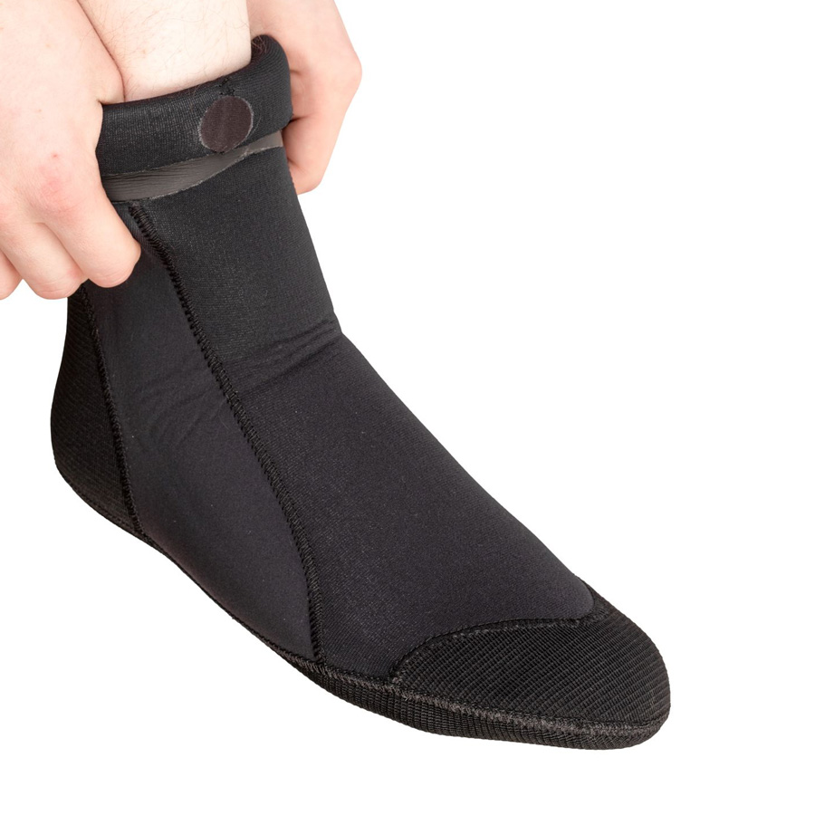 Носки «полусухого» типа SCORPENA Murman разработаны в первую очередь для подводных охотников, использующих ласты регулируемого типа (с открытой пяткой), например SCORPENA C. Для дополнительной защиты от истирания калошей ласты, передняя часть носка покрыта изностойким материалом типа supratex. Этим же материалом усилена задняя часть носка, чтобы защитить его от негативного воздействия резинового или пружинного ремешка. Анатомический крой носков различается для правой и левой ног, поэтому они отлично садятся на стопу, а форма одинаково удобна как для плавания, так и для длительных пеших переходов по пересечённой местности. Эти носки оснащены манжетой с внешним покрытием типа smoothskin, поэтому при надевании поверх неё штанов охотничьего гидрокостюма с «открытой порой» или гладкой манжетой изнутри, попадание воды внутрь сокращается до минимума. Но обязательно нужно проявлять аккуратность при надевании и снимании таких перчаток/носков; натягивать их следует взявшись не за манжету, а за часть покрытую тканью с обоих сторон! (см.фото)<br>