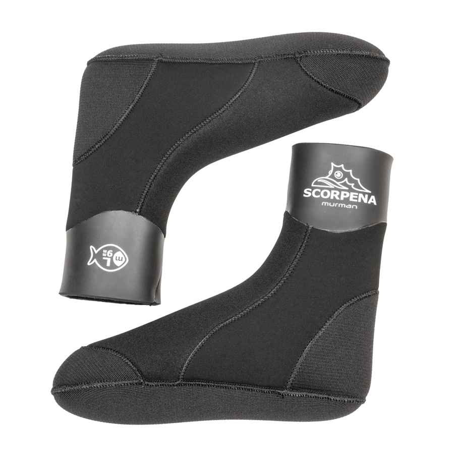 Носки изготовлены из нескольких марок оригинального неопрена фирмы SHEICO, склеены в торец неопреновым клеем на водной основе, сшиты «слепым швом» (при котором игла не пробивает неопрен насквозь, а только сшивает внешнюю ткань, что препятствует проникновению воды через швы). На носках SCORPENA Murman используется тканевое покрытие трёх различных типов. Зоны, где требуется максимальная растяжимость, покрыты лайкрой. Там, где нужна большая прочность использован нейлон. А в местах наибольшего истирания применено покрытие типа supratex. Все ткани приклеены к лицевой и изнаночной сторонам носков новейшим неопреновым клеем на водной основе. Для подошвы носков SCORPENA Murman использован более плотный неопрен с высокой степенью устойчивости к стаптыванию при ходьбе. Изнутри эта подошва снабжена мягким покрытием типа «плюш» для предотвращения проскальзывания при ходьбе по наклонным участкам, а снаружи покрыта максимально стойким к истиранию материалом типа supratex. Этот материал заходит спереди на мысок - до основания пальцев, а пятка защищена сзади и по бокам до ахиллова сухожилия.<br>