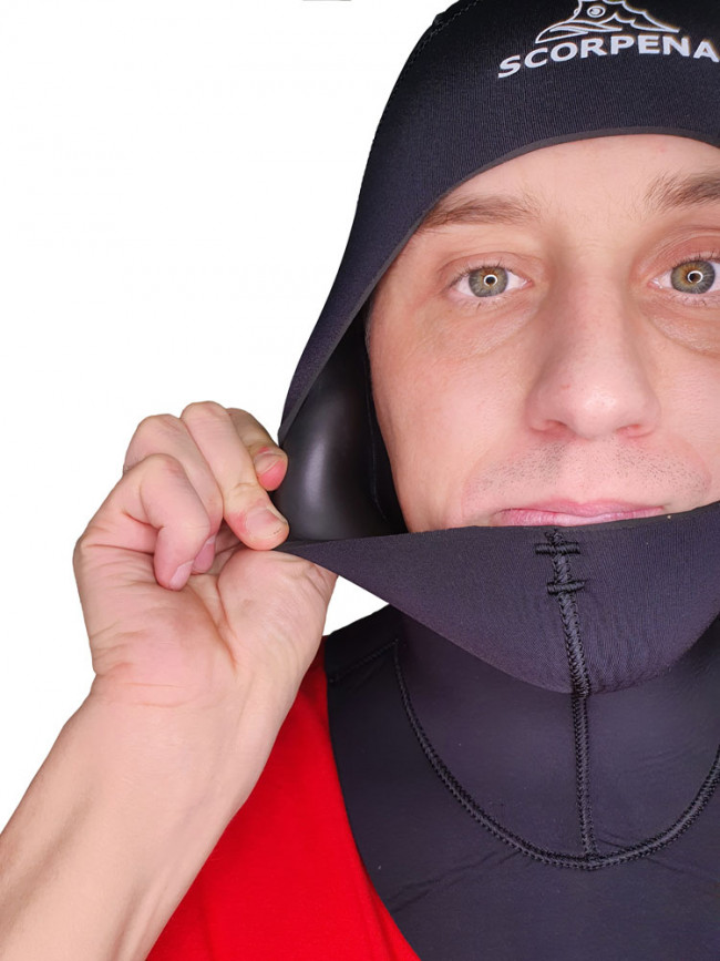 Шлем Scorpena изготовлен по оригинальным анатомическим лекалам из мягкого и эластичного неопрена и лишен грубых швов на внутренней поверхности – для предотвращения пережимания и натирания чувствительных мест лица и шеи. Широкая лицевая манжета имеет гладкую внутреннюю поверхность по всей окружности – для мягкого, но плотного прилегания к лицу и предотвращения проникновения воды к голове и шее. Снизу шлем переходит в широкую манишку, которая благодаря своим размерам, а также внутренней гладкой поверхности smoothskin отлично прилегает к верхней части торса и предотвращает затекание воды к шее снизу.