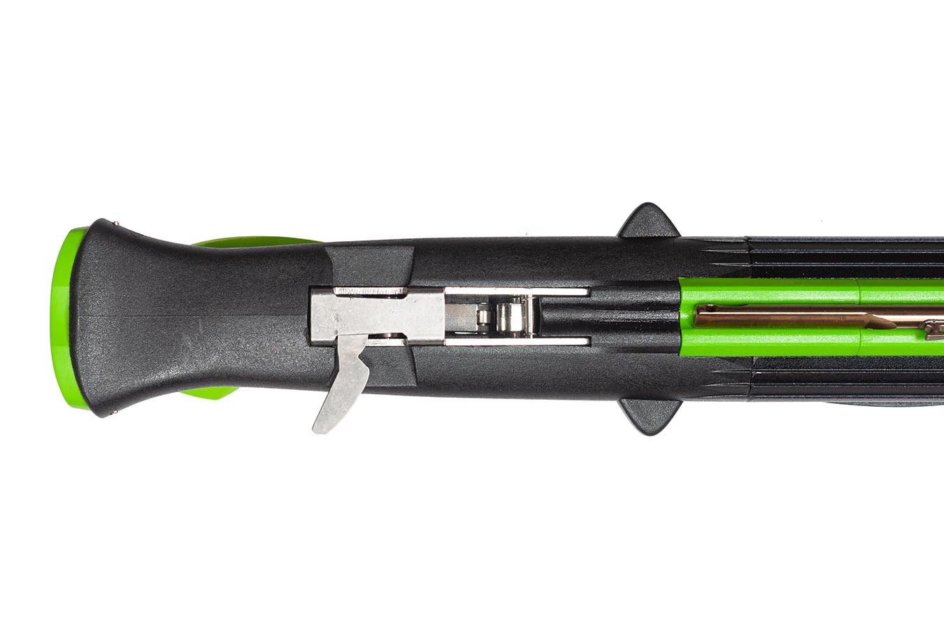 - Триггерный механизм серии «METAL», заслуживает отдельного внимания. За счет стального ролика по которому и ходит спусковой механизм, какая бы не была нагрузка на него, усилие с которым нужно нажать на курок не меняется. То есть курок нажимается как в разряженном состоянии, так и в заряженном с одинаковым усилием. Это само собой увеличивает точность выстрела в разы. И нагрузка в 380 кг. Которую выдерживает данный механизм, просто поражает воображения. Одна тяга 16 мм дает 35-40 кг. Это 10 тяг можно натянуть и его не вырвет. Плюс он, как и впрочем, все триггеры Salvi реверсивного типа и смещен максимально близко к упору ружья, что увеличивает длину разгона гарпуна. Как не странно, почти у всех именитых брендов этого нет. И 80% других подводных арбалетов будут по мощности на один шаг длины проигрывать. То есть, если взять два ружья с одинаковыми тяги, но одно с реверсивным триггерным механизмом, а второе с обычным устаревшим, то Salvimar 95-ка будет стрелять как ружье с устаревшим триггерным механизмом 105-ка. Потому что просто на 10 см больше разгон гарпуна. Именно у героя идет триггерный механизм, не просто метал, а «heavy metal» (Тяжелый метал) Там сталь 3 мм просто в корпусе триггера, а шептало вообще 5 мм.
