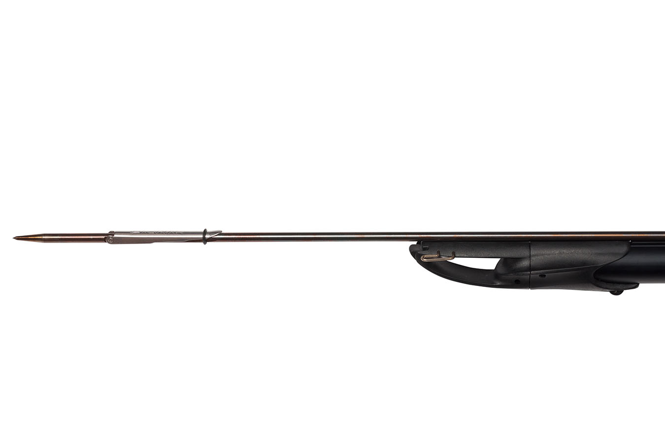 - Линесброс боковой и сделан из той же нержавеющей стали 17-4 PH. Линесброс, кстати, максимально смещен к торцу ружья, что увеличивает длину рабочего линя.