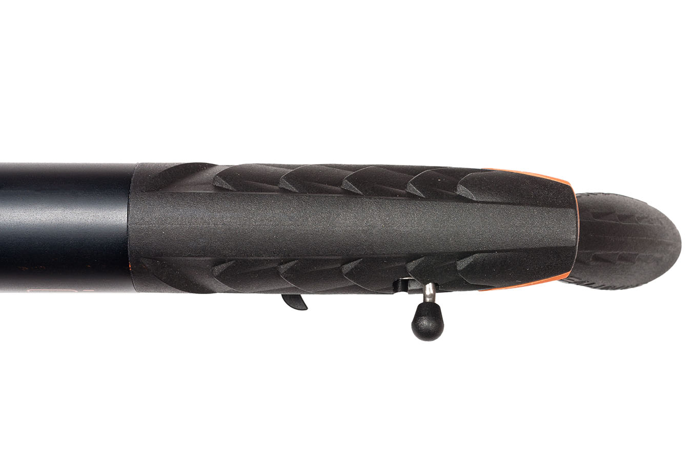 - Очень удобная рукоять сделанная из армированного стекловолокном нейлона имеет эргономичную форму и наклонена по отношению к ресиверу на 30 градусов, что делает даже очень продолжительную подводную охоту комфортной. А главное она достаточно большая, и ружье удобно держать даже в рукавице 9 мм.