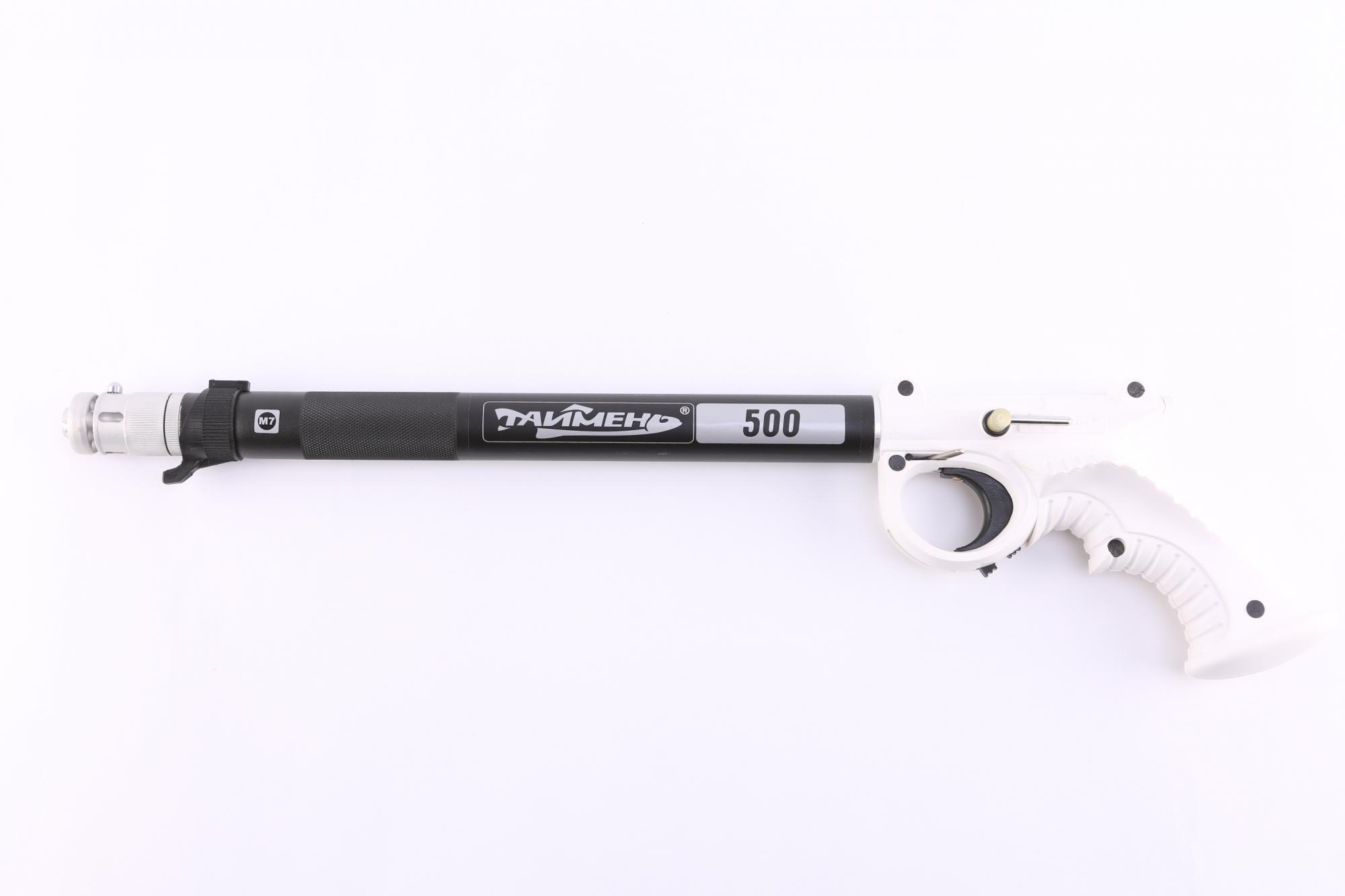 Ружьё для подводной охоты пневматическое(пневмовакуумное) Таймень PVRM-RV 500 ф7 БЛС, подводное ружьё длинной 50 см отлично зарекомендовавшее себя при охоте на крупную рыбу в густой траве, камыше и коряжнике когда необходимо сочетание мобильности ружья и его высокой мощности. Дальность боя до двух метров. Гарпун диаметром 7 мм делает выстрел более динамичным. Анатомическая рукоятка дает более жесткую фиксацию ружья в руке. Регулятор боя дает возможность уменьшит силу выстрела на 40% что делает охоту на мелководье в коряжнике и камнях более удобной. Боковой линесброс позволяет удобно установить катушку и фонарь, линь хорошо лежит вдоль ружья не собирает траву и не цепляется за коряжник. Резиновая манжета в надульнике создает в стволе вакуум, уменьшает попадание в ствол мелких частиц (песка, ила) а также воды, отсутствие воды в стволе при движении поршня и гарпуна значительно повышает силу выстрела и обеспечивает эффективность охоты при небольшом усилии заряжания.