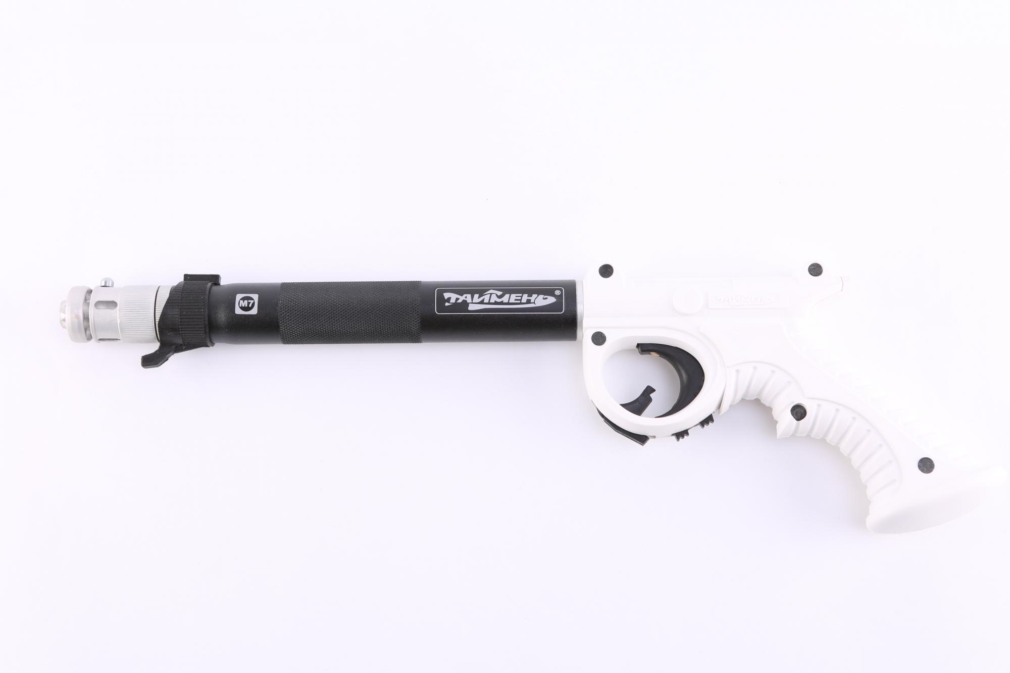 Ружьё для подводной охоты пневматическое(пневмовакуумное) Таймень PVM-RV 400 ф7(У), небольшое очень маневренное подводное ружьё длинной 40 см, хорошо подходит для подводной охоты в густой траве, камыше и коряжнике. Дальность боя до одного метра. Гарпун диаметром 7 мм делает выстрел более динамичным. Универсальная рукоятка дает возможность использовать ружьё как правой так и левой рукой. Резиновая манжета в надульнике создает в стволе вакуум, уменьшает попадание в ствол мелких частиц (песка, ила) а также воды, отсутствие воды в стволе при движении поршня и гарпуна значительно повышает силу выстрела и обеспечивает эффективность охоты при небольшом усилии заряжания.