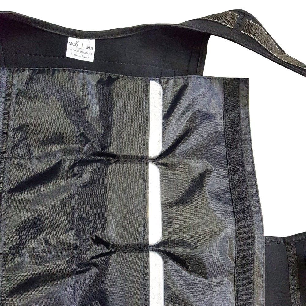 Неопреновый разгрузочный жилет Scorpena сделан из 2мм неопрена. Этот жилет имеет 6 отделений для грузов на спине и два дополнительных боковых кармана для еще двух грузовых пластин.