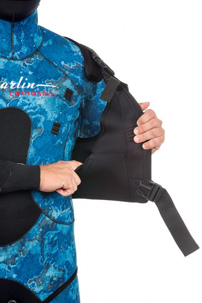 Бороздя подводные просторы в поисках трофея, мы натыкаемся на разные мелочи: зачастую это воблеры, блесна, которые хотелось бы взять с собой на берег. Но возникает вопрос: куда это положить? Ведь эти предметы не совсем безопасные для костюма. Компания Marlin нашла выход в виде кармана из плотного материала Oxfford 600D. В сложенном состоянии карман спрятан за правую половину жилета и не нарушает его форм. При необходимости очень быстро достаётся и с лёгкостью прячется. Карман имеет прямоугольную форму с полезным размером 14х19 см.