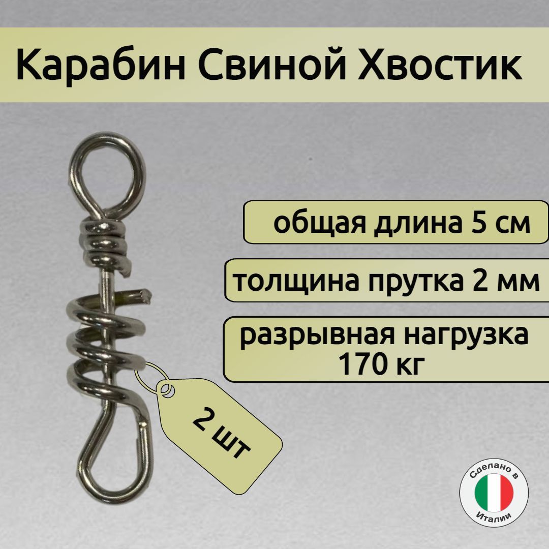 Витой карабин "свиной хвост". Карабин, это одна из неотъемлемых деталей подводного ружья, как пневматического, так и арбалета. Замок необходим для быстрого отсоединения линя с гарпуном от ружья, для снятия простреленной насквозь рыбы или замены гарпуна с линём на запасной.